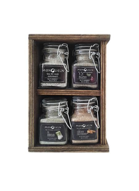 4 Saleros herméticos 100 gr sal de mar a elección, en caja de madera con vidrio.